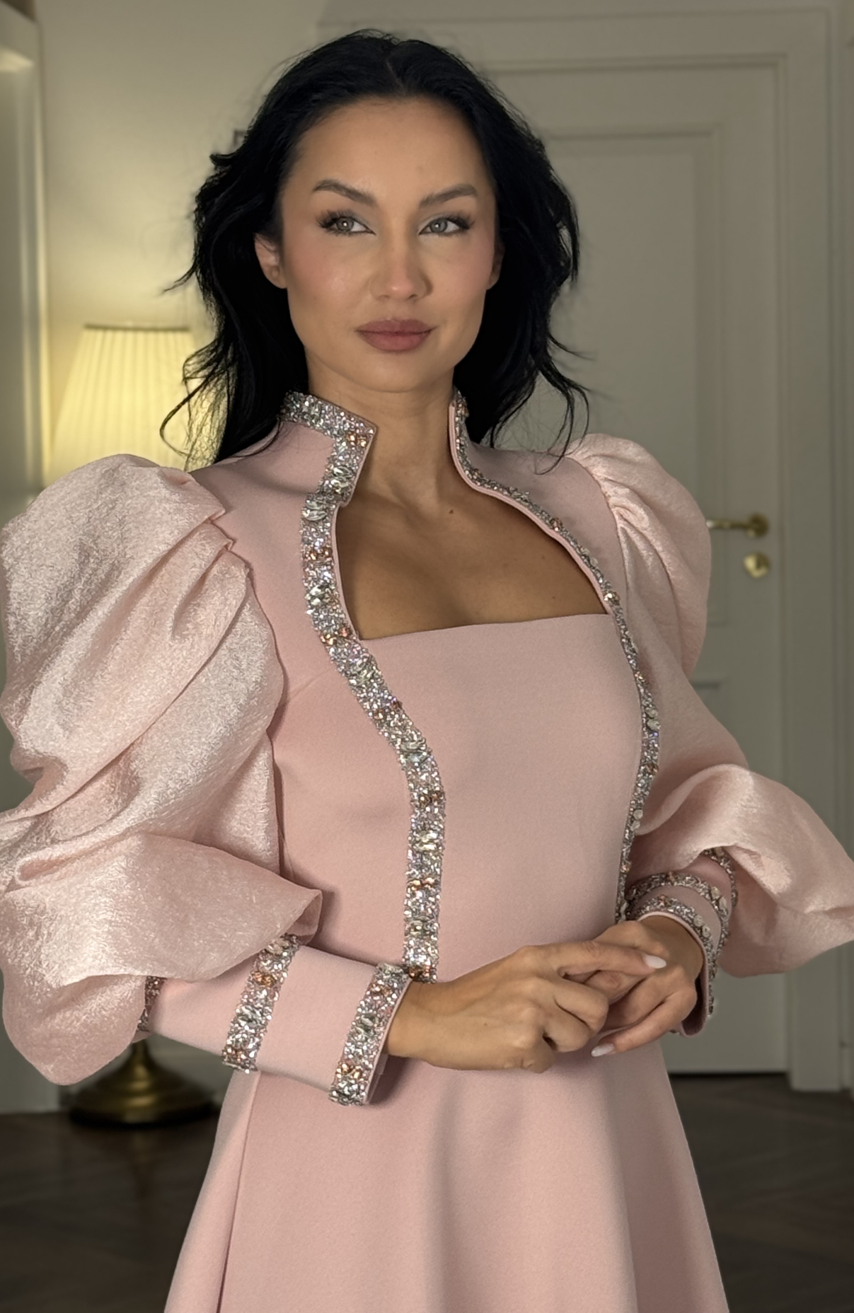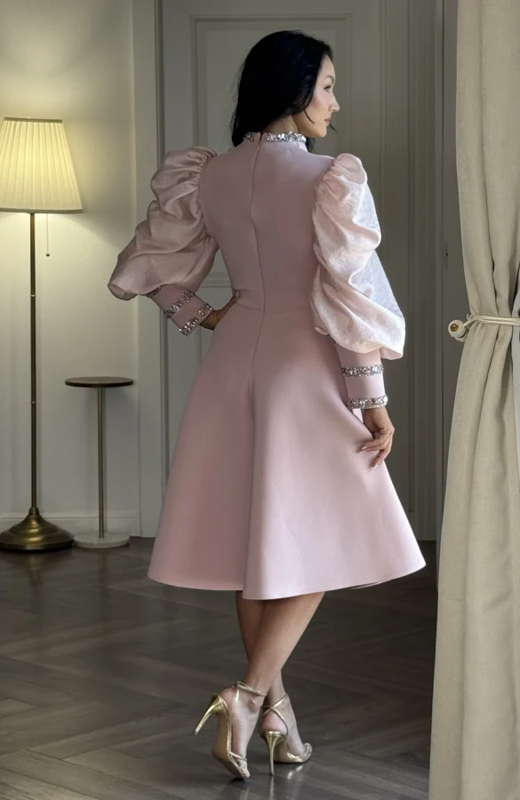 Rochie de ocazie roz midi cu maneci bufante si pietre este modelul ideal de rochita pentru doamnele care iubesc eleganta.