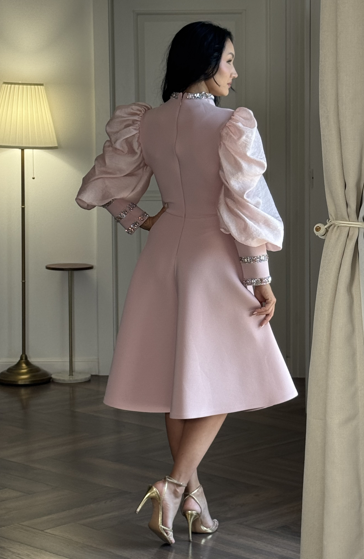 Rochie de ocazie roz midi cu maneci bufante si pietre